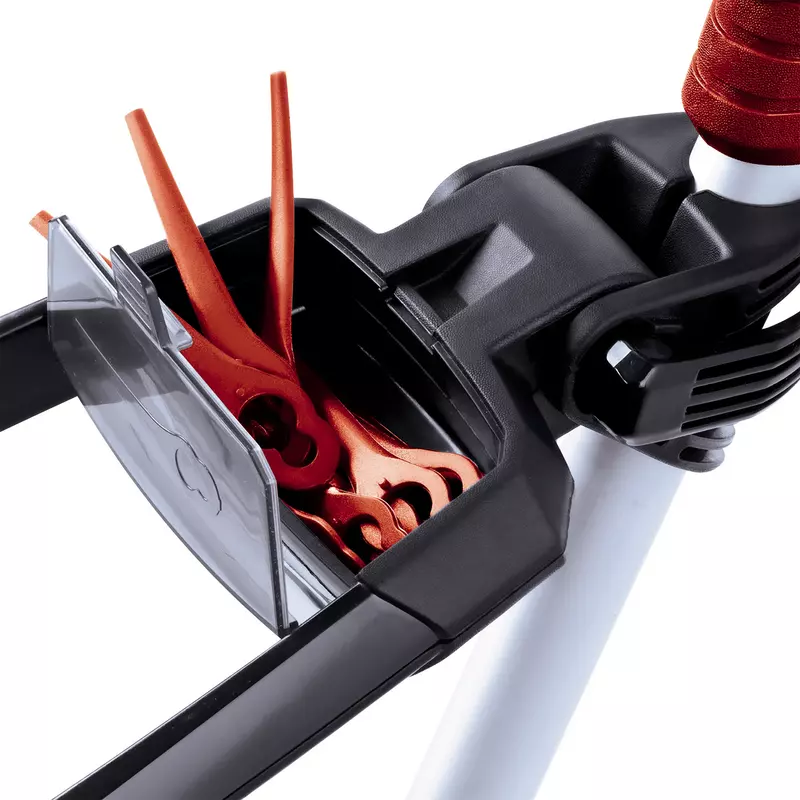 Akku-plænetrimmeren GE-CT 18 Li Kit er en effektiv maskine, som sikrer en velplejet plæne på steder, hvor plæneklipperen ikke kan komme til. Takket være det nye Power X-Change-batterisystem fra Einhell er plænetrimmeren forsynet med en 18-V-akku med 2,0 Ah til lange arbejdspas uafhængigt af lysnettet. På akku-tilstandsindikatoren med tre LED'er er det endvidere muligt at aflæse den aktuelle ladetilstand øjeblikkeligt. Det trinløst teleskoperbare styr på GE-CT 18 Li Kit kan tilpasses til enhver brugerhøjde og sikrer en komfortabel håndtering. Takket være softgrip-overflader, trinløst justerbart ekstragreb med integreret klingeopbevaring til 20 klinger og det +/- 90° drejelige motorhoved, der kan vinkles i fem faste trin, er det muligt at klare vanskelige arbejdssituationer som f.eks. lodrette flader og plænekanter ubesværet og bekvemt. En hurtigoplader medfølger ved levering. Akkuen kan endvidere anvendes til alle maskiner i Power X-Change-familien. Til beskyttelse af blomster, stauder og andre følsomme gevækster er maskinen udstyret med en plantebeskytter. Der medfølger også 20 robuste kunststofklinger.